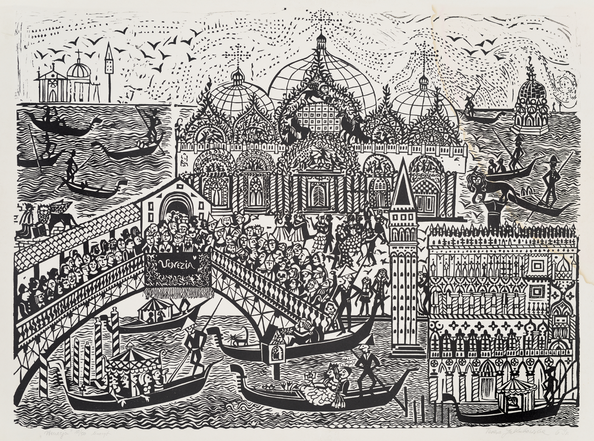 The collection of the Zachęta — National Gallery of Art includes a print by Teresa Jakubowska entitled Venice (1969). The artist captured the crucial elements that identify the city: most notably, the gondolas, but also the pearls of its architecture — St Mark’s Basilica, with people in carnival masks dancing in front of it, the Doge’s palace, the church of Santa Maria della Salute, the Rialto bridge, and the Venetian lions.