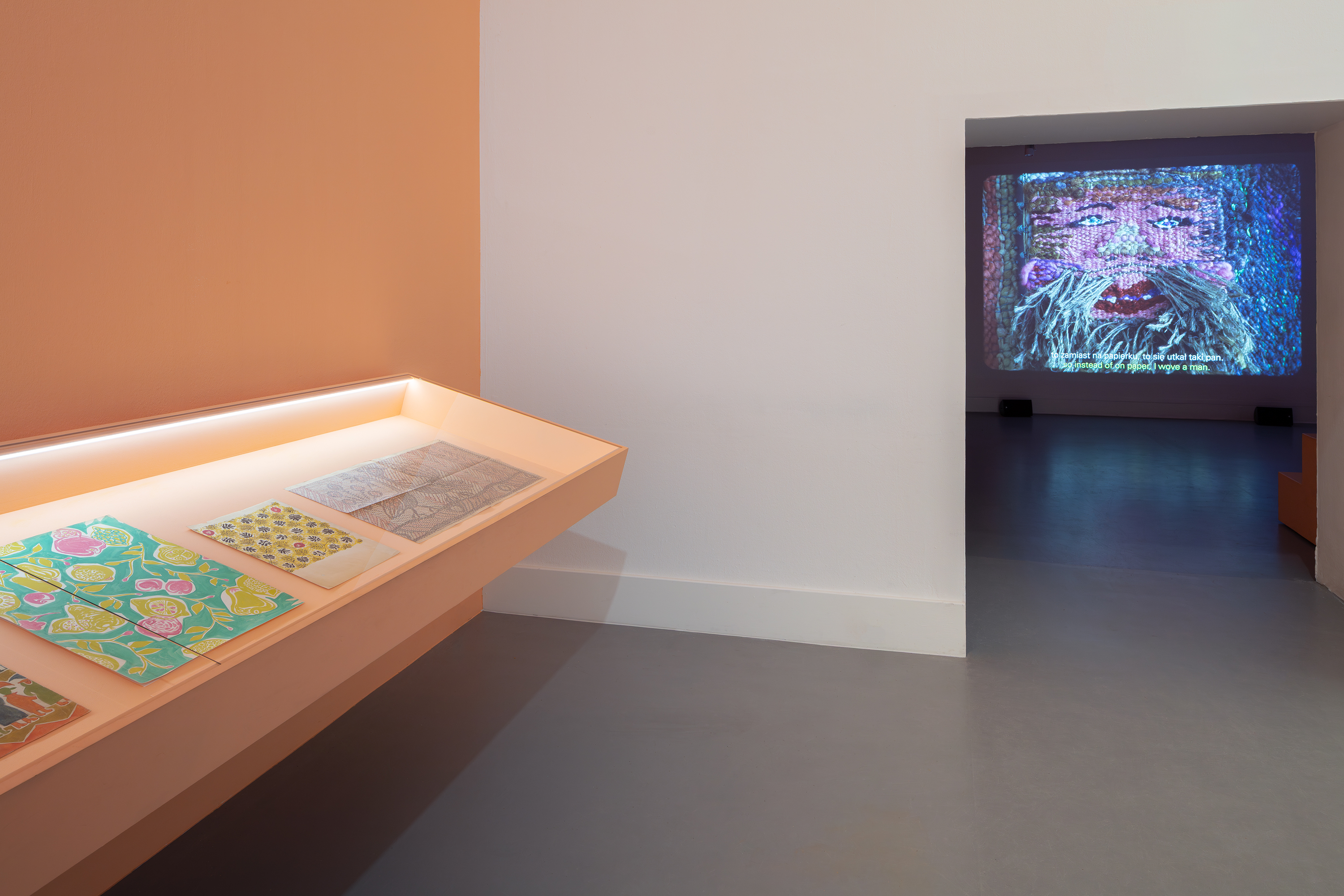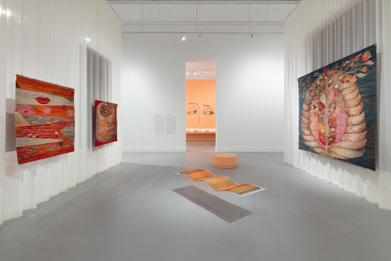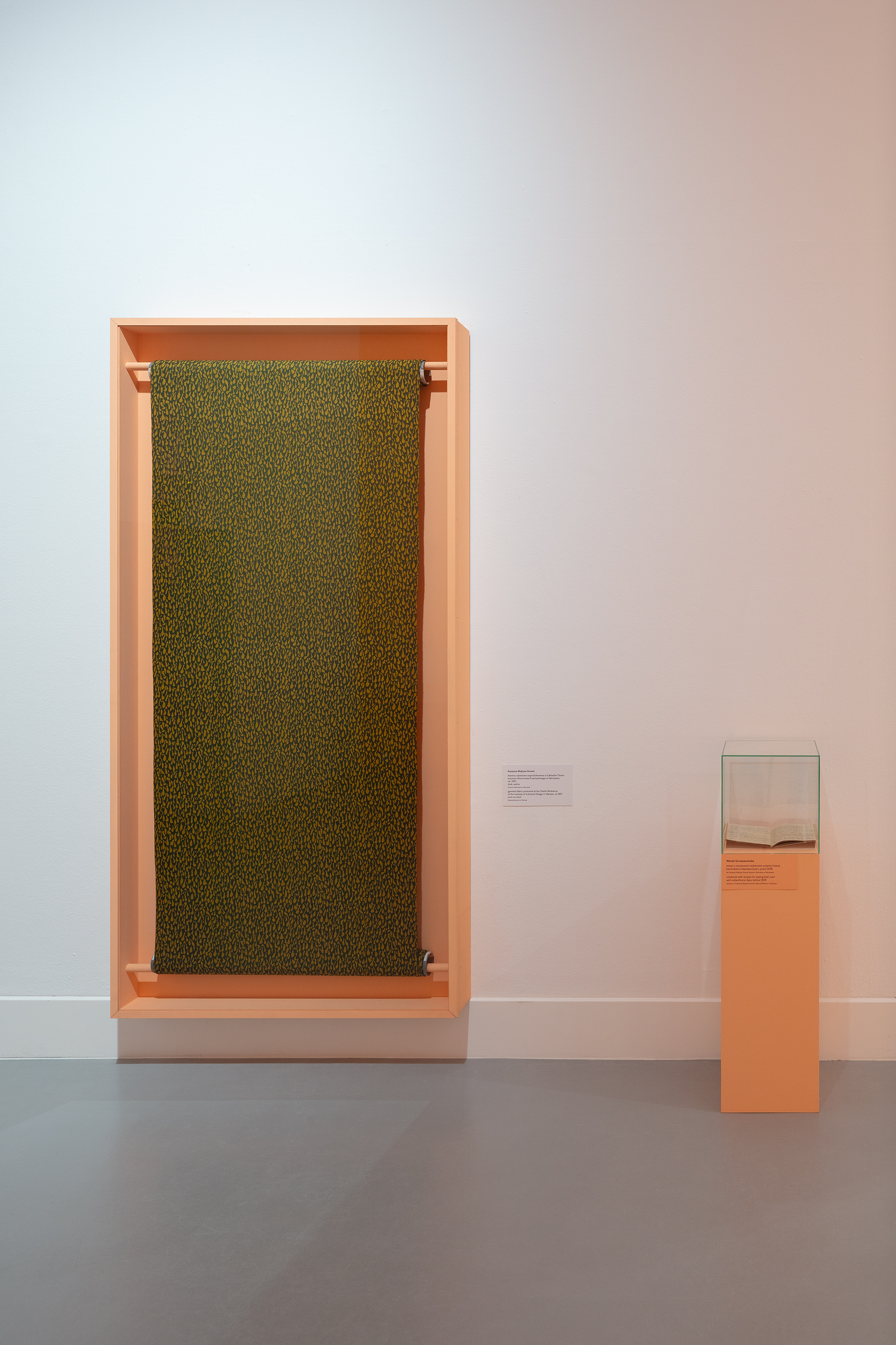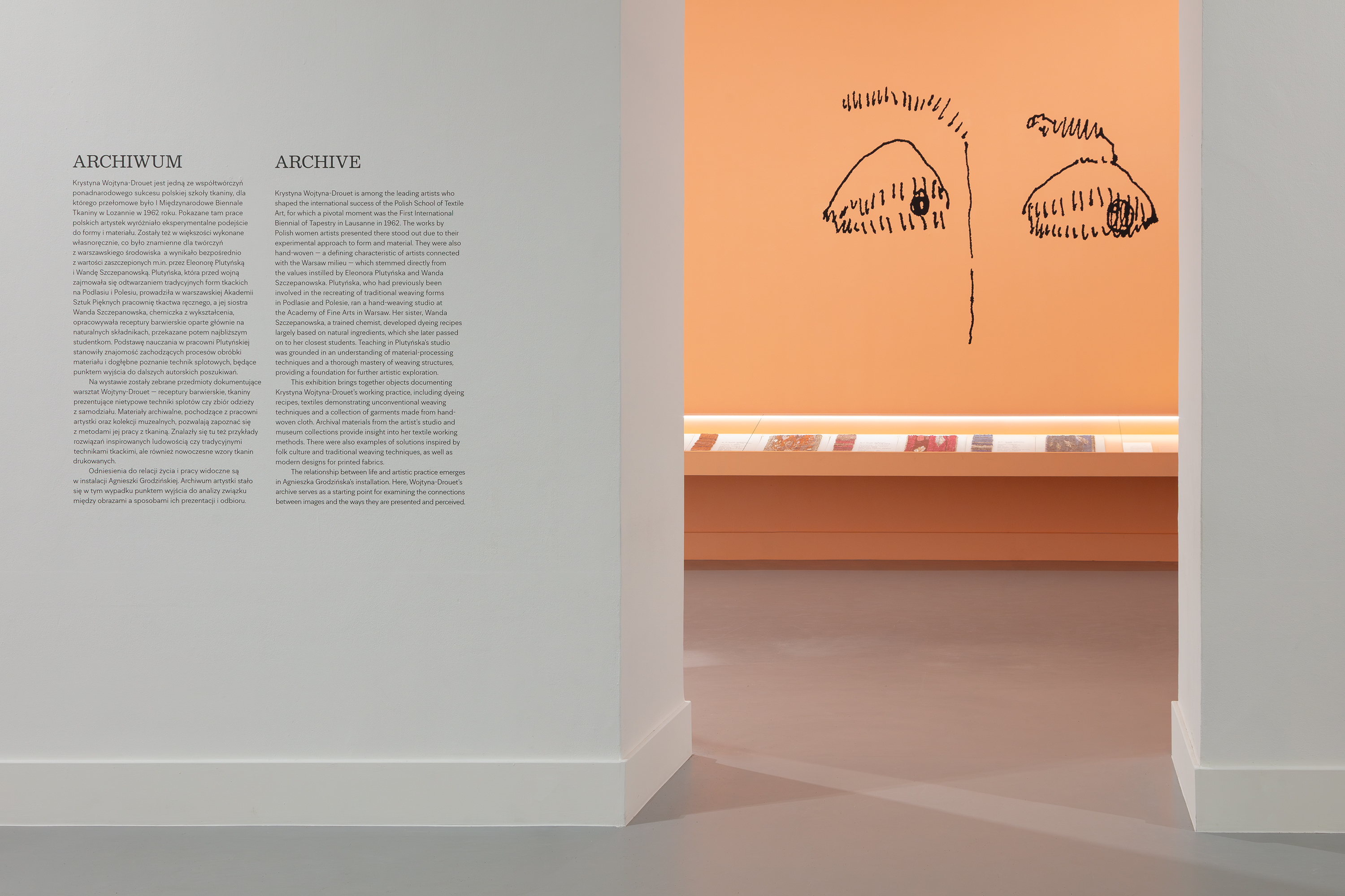 14. Wystawa Krystyna Wojtyna-Drouet. Ja dla siebie nie istnieję, Zachęta – Narodowa Galeria Sztuki, 20.02 – 04.04.2026, od lewej: projekt wzoru na tkaninę drukowaną, przed 1962, akwarela, papier; Alexander Cabeza-Trigg, Maria Oblicka, Jestem jak harfa, 2025, i