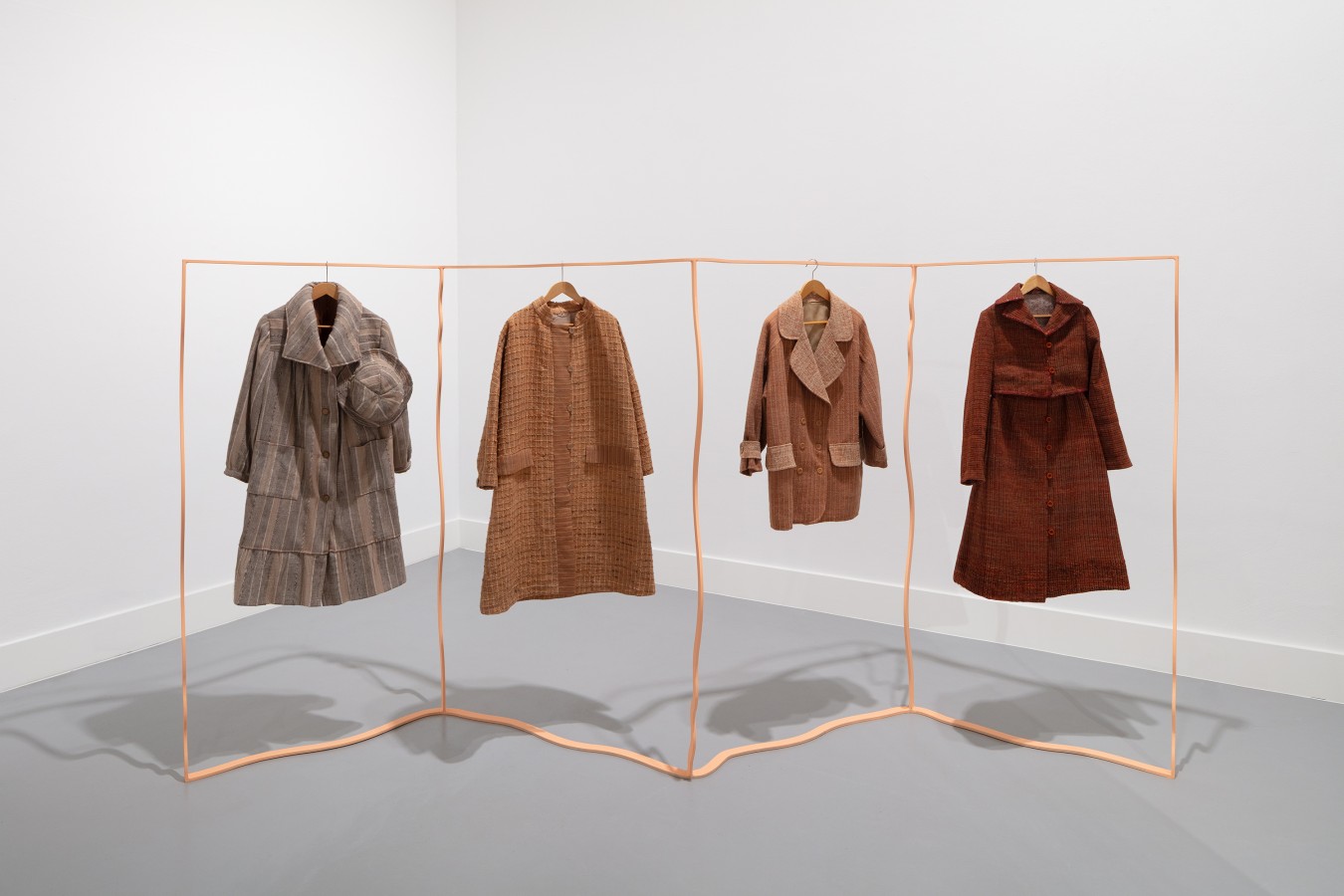 7. Wystawa Krystyna Wojtyna-Drouet. Ja dla siebie nie istnieję, Zachęta – Narodowa Galeria Sztuki, 20.02 – 04.04.2026, zestaw odzieży z samodziału, lata 60.–70. XX wieku, wełna, bawełna, poliester, szycie ręczne i maszynowe, fot. Daniel Rumiancew / archiwum Z